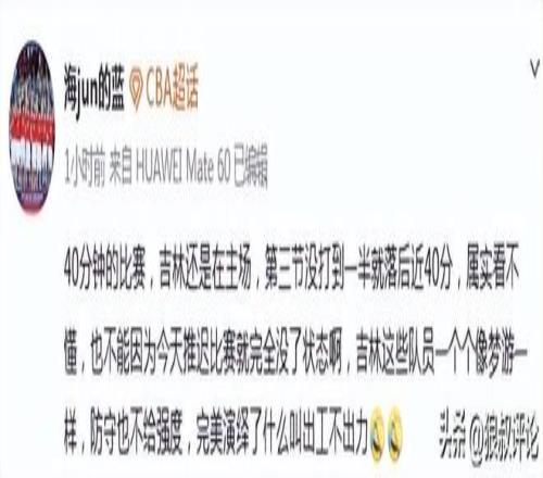 媒体人“海jun的蓝”发文点评:40分钟的比赛,吉林还是在主场,第三节没打到一半就落后近40分,属实看不懂,也不能因为今天推迟比赛就完全没了状态啊,吉林这些队员一个个像梦游一样,防守也不给强度,完美演绎了什么叫出工不出力。
